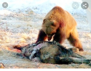 In the Canadian Rockies and other areas, grizzly bears can be especially carnivorous, hunting moose, elk, mountain sheep, and mountain goats. Occasionally black bears are preyed upon. In Alaska, brown bears have been observed to eat carrion and occasionally capture young calves of caribou and moose. Brown bears have observed in a number of places feeding on breeding salmon in the summer. [Source: Tanya Dewey and Liz Ballenger, Animal Diversity Web (ADW) |=|]