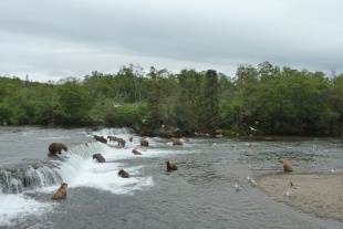 At the salmon feeding area on the Brooks River in Katmai National Park in Alaska bears establish a hierarchy which allows them to interact with each other without violence (usually). It is based on a system of social interactions communicated through body posturing, scent, and vocalizations. In the hierarchy, subordinate bears typically yield space and/or resources to more dominant bears. In general large and mature males are most dominant, followed by females with cubs, other adult males and females, and subadults. A bear’s place in the hierarchy is based on its health, age, size, and disposition. The hierarchy is fluid and the rank of a bear can change from year to year or even season to season. In 2015, bears like 747, 814, and 856 were the most dominant bears observed along the river. [Source: U.S. National Park Service, September 30, 2016]