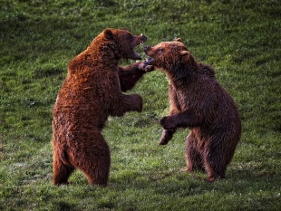 Brown bears are largely solitary animals Males are often solitary while sows often hang out with their cubs. Because they cover large distances in the search of food, brown bears are less territorial than other large carnivores. Home ranges of different bears often overlap. When bears come in contact with one another they usually keep their distance and don’t fight with one another. Young brown bears like to play. Even adults have been observed sliding down snowy hills, toying with fish by tossing them around, play wrestling in water holes, scratching their backs on trees, and playing tag with ravens. They have also been observed shadowboxing with their own breath and making snowballs.