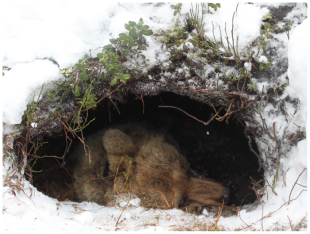 In the 1970s, radio collaring observations discovered that some of the bears using the Brooks River at Katmai National Park in southern in September and October made dens on nearby mountains—Dumpling, La Gorce, Katolinat, and Kelez. Most dens were between 152-457 meters (500-1500 feet) in elevation. Dens are usually located on steep, heavily vegetated slopes. In Katmai, bears are not known to use the same den for two or more winters. Most dens that rangers and biologist have examined are partially collapsed by mid to late summer preventing reuse. Katmai’s bears are not known to den in sites like tree cavities, rock crevasses, or caves that would be more stable. Bears in Katmai usually enter their dens in October and November. In general, pregnant females and females with cubs enter dens earlier than single females and subadult bears. Adult males usually are the last to enter their dens and some bears can be active into December. [Source: U.S. National Park Service, September 30, 2016]