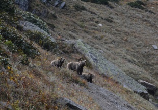 Himalayan brown bears are the largest mammal in the Himalayas. They are omnivorous and hibernate in dens during the winter. The bears go into hibernation around October and emerge during April and May. Hibernation usually occurs in a den or cave made by the bear. Himalayan brown bears eat grasses, roots, fruits, berries and other plants as well as insects and small mammals. They have been observed eating sheep and goats and occasionally take animals from villagers. [Source: Wikipedia]