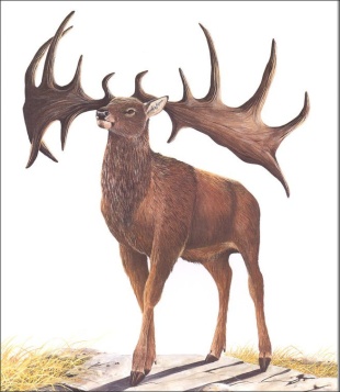 All extinct and living deer are thought to have evolved during the Miocene Period (23 million to 5.3 million years ago) and early Pliocene Period (5.4 million to 2.4 million years ago) from a Eurasian ancestor known as protodeer (Dicroceridae). The first true cervids appeared about 20 million years ago during the Early Miocene (23 million to 16 million years ago), which is around the same time cervids began moving from Asia into Europe and North America. Early cervids began movement into North America via the Berigian Land Bridge and became relatively common in North America during the early Pliocene Period (5.4 million to 2.4 million years ago). Some Pleistocene Period (2.6 million to 11,700 years ago) cervids had spectacular antlers. For example, the "Irish elk" Megaloceros, which was not an elk and was not restricted to Ireland, had large palmate antlers with a span up to 3.7 meters and a weight around 45 kilograms. In North America, the giant stag moose had tripalmate antlers that spanned almost five feet in width. Another extinct deer with spectacular antlers was Eucladoceros, a large animal whose antlers were made up of many of irregularly branched tines. Synapomorphies (characteristics found in an ancestral species and shared by their evolutionary descendants) of extant cervids include deciduous antlers, no upper incisors, two lacrimal orifices on or outside the orbital rim, and an ethmoidal or antorbital vacuity that terminates the lacrimal short of nasal articulation. /=\