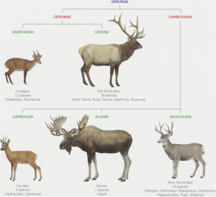 As is the case with many families within the order Artiodactyla, a well-supported history and taxonomy of Cervidae has yet to be established. According to Gilbert et al. (2006), which used mitochondrial and nuclear DNA to determine the phylogenetic relationship between species, Cervidae can be broken down into two subfamilies, Cervinae and Capriolinae. However, Hernandez-Fernandez and Vrba (2005) provide support for three subfamilies, Hydropotinae, Cervinae, and Odocoileinae. [Source: Katie Holmes; Jessica Jenkins; Prashanth Mahalin; John Berini, Animal Diversity Web (ADW) /=]