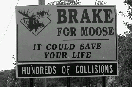 A leisurely Sunday drive for a couple in southern Norway came to an abrupt end when a fully grown moose suddenly landed on the roof of their car. "We didn't even have time to think when there came this enormous thud," said a shaken Leo Henriksen after the bizarre incident. He and his wife were cruising along the two-lane Highway 405 in their little red Mazda. [Source: Aftenposten English Web Desk, February 24, 2003]