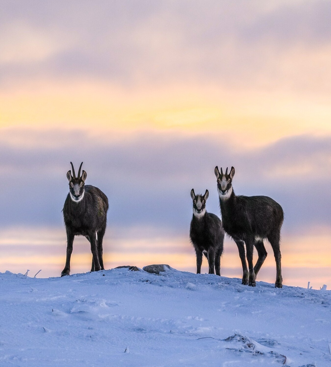 Chamois don't like warm weather. They graze at highland pastures in the summer and only descend to the valleys in the winter. Sometimes it is possible to see them in May and June at the bottom of the valleys but as the snow melts they move higher up.