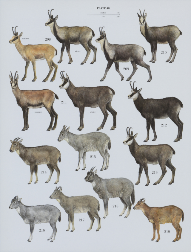 Chamois and Goral species: 208) Pyrenean Chamois (Rupicapra pyrenaica), 209) Abruzzi Chamois (Rupicapra ornata), 210) Cantabrian Chamois (Rupicapra parva), 211) Alpine Chamois (Rupicapra rupicapra), 212) Carpathian Chamois (Rupicapra carpatica), 213) Asia Minor Chamois (Rupicapra asiatica), 214) Himalayan Brown Goral (Nemorhaedus goral), 215) Himalayan Gray Goral (Nemorhaedus bedfordi), 216) Chinese Goral (Nemorhaedus griseus), 217) Burmese Goral (Nemorhaedus evansi), 218) Long-tailed Goral (Nemorhaedus caudatus), 219) Red Goral (Nemorhaedus baileyi)