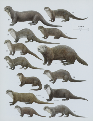Some Otter species: 27) Giant Otter (Pteronura brasiliensis), 28) North American River Otter (Lontra canadensis), 29) Marine Otter (Lontra felina), 30) Neotropical Otter (Lontra longicaudis), 31) Southern River Otter (Lontra provocax), 32) Sea Otter (Enhydra lutris), 33) Spotted-necked Otter (Hydrictis maculicollis), 34) Eurasian Otter (Lutra lutra), 35) Hairy-nosed Otter (Lutra sumatrana), 36) African Clawless Otter (Aonyx capensis), 37) Asian Small-clawed Otter (Aonyx cinereus), 38) Smooth-coated Otter (Lutrogale perspicillata)