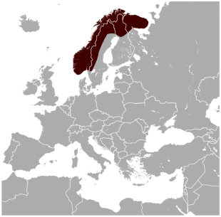 A common species of lemming, Norway lemmings are found in northern Fennoscandia (Scandinavia and the Karelia part of Russia), where they are the only vertebrate species endemic to the region. These lemmings are active both day and night, alternating naps with periods of activity. They dwells in tundra and fells, and prefers to live near water. Adults feed primarily on sedges, grasses and moss. By some reckonings, Fennoscandia, where Norway lemmings live, stretches from the Russian Kola Peninsula in the east to the west coast of Norway in the west and from the northern coast of Norway south to the Baltic Sea. However, Norway lemmings may migrate further south than that during on of their population booms.