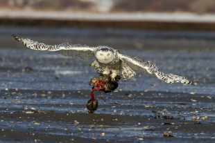 Snowy owls are both specialized and generalist hunters. They must capture the equivalent of seven to 12 mice a day to meet its food requirements. Their breeding efforts and global population are closely tied to the availability of tundra-dwelling lemmings, but in the non-breeding season, and occasionally during breeding, the snowy owl can adapt to almost any available prey – most often other small mammals and northerly water birds, as well as, carrion. [Source: Wikipedia]