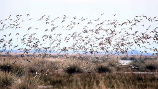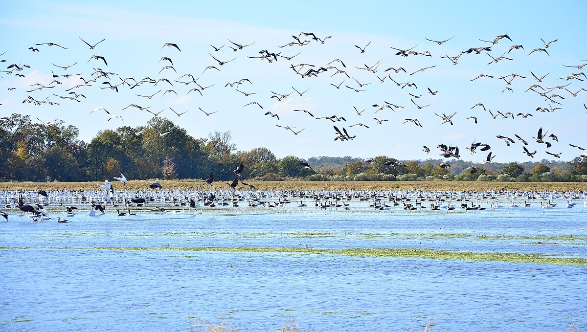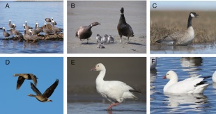 Geese and swans are among the heaviest birds. They have long necks and are mostly herbivores. Ducks are smaller, with shorter necks and eat a wider variety of food, ranging from flies to floating algae to fish. Males tend to be colorful while females are drab. Many northern hemisphere species of waterfowl breed in the marshes, lakes and tundra of Alaska, Canada and Siberia and migrate to wintering areas further south. The 15 species of true geese are found mainly in the Arctic and subarctic regions. They are gregarious and can live for a long time (captive birds live up to 50 years). Canadian geese and snow geese belong to this group.