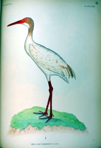 Siberian cranes are majestic birds that have been described as poetry in motion because of their slow and deliberate movements and graceful mating dance. Their vocalizations are said to be flute-like with tones that float down to earth like music from the sky. Siberian cranes are the most far-ranging cranes. They migrate 5,000 kilometers (3,000 miles) between their breeding ground in the Siberian Arctic and their wintering grounds in China and Iran. The journey of teh two populations passes through 11 countries and covers large distances over inhospitable terrain. The birds stop at wetlands along the way and call continuously when they fly.