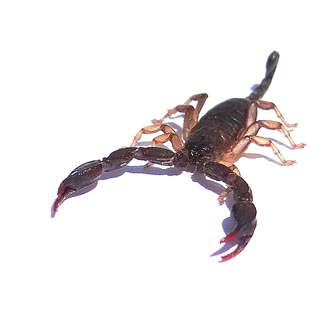 European yellow-tailed scorpions. (Euscorpius flavicaudis or Tetratrichobothrius flavicaudis) are small black scorpion with yellow-brown legs and tail (metasoma). Adults measure about 3.5 to 4.5 centimeters (1.4–1.8 inches) long. They have relatively large, strong claws (pedipalps) and a short, thin tail. They are native to Southern Europe and Northwest Africa, but an introduced population exists in the United Kingdom. [Source: Wikipedia]