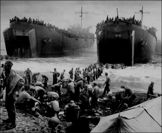 Ray Anderson, a gunner on a navy ship at Leyte, wrote: “On October 19th, we remained at our battle stations all day long and went to condition 2 watches (Port and Starboard), four hours on and our hours off. At dawn on October 20th we could see the Island of Leyte - our objective - and more than 700 ships passed between two islands to go into the Gulf. Japs had fled taking only their rifles with them. At midnight we passed through the entrance into the Gulf. The convoy kept changing speed and course which made it very difficult to keep in station. We almost rammed the ship ahead of us once. For three days previously larger ships in our convoy had begun the initial bombardment and fleet minesweepers had swept the Gulf. We could see tracer shells from battleships, carriers, cruisers and destroyers blasting away at the beach. When the sun came over the horizon our planes appeared overhead en route to the beach on bombing missions. The Naval bombardment and aircraft bombing became heavier and heavier. The noise was terrific. [Source:Ray Anderson's Eyewitness Account to World War II, The American Legion, legion.org/yourwords ==]