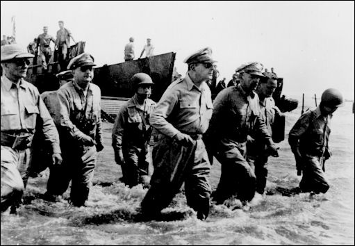 On October 20, 1944, MacArthur made his famous landing on Leyte beach. "He wore a crisply starched uniform," wrote historian Geoffrey Ward, "and the sunglasses and soft cap that had become his trademark, and he was eager to step ashore and proclaim his return. Then, 50 yards out, the barge ran aground. Landing craft burned around him, bodies were rolling in the surf, sniper bullets still whined overhead, and when the harried harbor master heard about the general's potential embarrassment he was unmoved. "Let 'em walk! he said."