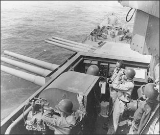 “After sunset we moved from the beachhead and anchored in front of a heavy cruiser. The cruiser kept firing at the beach all morning with its 6" guns. We were so close to the cruiser that every time they fired a salvo our whole ship would shake and puffs of wind from the gun blasts blew back my cabin curtain each time they fired. The entire ship would vibrate. The lamp in my cabin rattled and the typewriter desk and typewriter would shake making it difficult for me to type.” ==