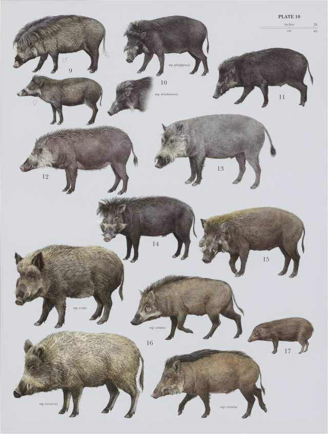 Some wild pig species: 10 Philippine Warty Pig (Sus philippensis) Mindoro Warty Pig (Sus oliven) 12 Palawan Bearded Pig (Sus ihoanobirbus) 13 Bearded Psg (Sus barbatus), 14 Sulawesi Warty Pig (Sus celebensis) 15 Javan Warty Pig (Sus venucosus) 16 Eurasian Wild Pig (Sus scrola) 17 Pygmy Hog (Porciila salvimi)