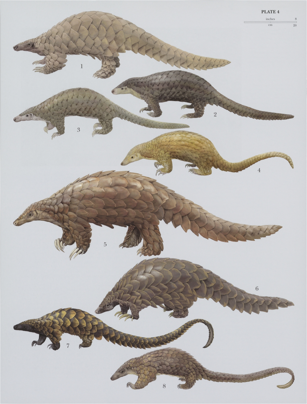 Pangolin species: 1) Indian pangolin; 2) Chinese pangolin; 3) Sunda pangolin; 4) Palawan pangolin; 5) Giant pangolin; 6) Ground pangolin; 7) Long-tailed pangolin; 8) Common African pangolin
