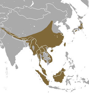 Asian palm civets are found throughout southern Asia, ranging the Philippines in east to Kashmir in the west. They are most widespread in southern China, the northern Himalayas, southern India, and islands in the Indian Ocean, South China Sea, and the Philippine Sea. Significant populations of Asian palm civet exist in India, Bhutan, Nepal, Sri Lanka, Thailand, Vietnam, Cambodia, Malaysia, Indonesia, Laos, Singapore, Sumatra, Java, Borneo and the Sundas Islands. /=\