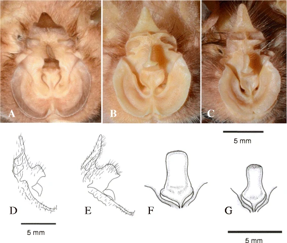 The fur of horseshoe bats is long and smooth in most species and varies from reddish-brown, to blackish, or bright orange-red. Their ears are large and leaf-shaped, nearly as wide as they are long, and conspicuously lack tragi (a prominence on the inner side of the external ear). Their eyes are very small. The skull has a bony protrusion on the snout called rostral inflation. Like most bats, horseshoe bats have two mammary glands on their chests. Adult females additionally have two teat-like projections on their abdomens, called pubic nipples or false nipples, which are not connected to mammary glands.