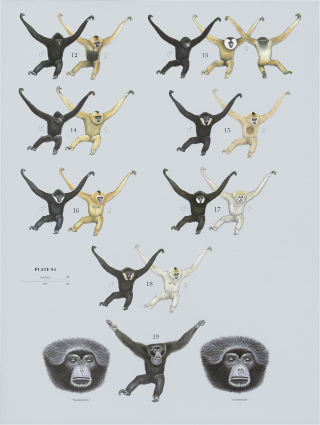 Nomascus gibbon species: 2) Western Black Crested Gibbon (Nomascus concolor), 13) Eastern Black Crested Gibbon (Nomascus nasutus), 14) Hainan Crested Gibbon (Nomascus haimmanus), 15) Northern Yellow-cheeked Crested Gibbon (Nomascus annamensis), 16) Northern White-cheeked Crested Gibbon (Nomascus leucogenys), 17) Southern White-cheeked Crested Gibbon (Nomascus siki), 18) Southern Yellow-cheeked Crested Gibbon (Nomascus gabriellae), 19) Siamang (Symphalangus syndactylus)