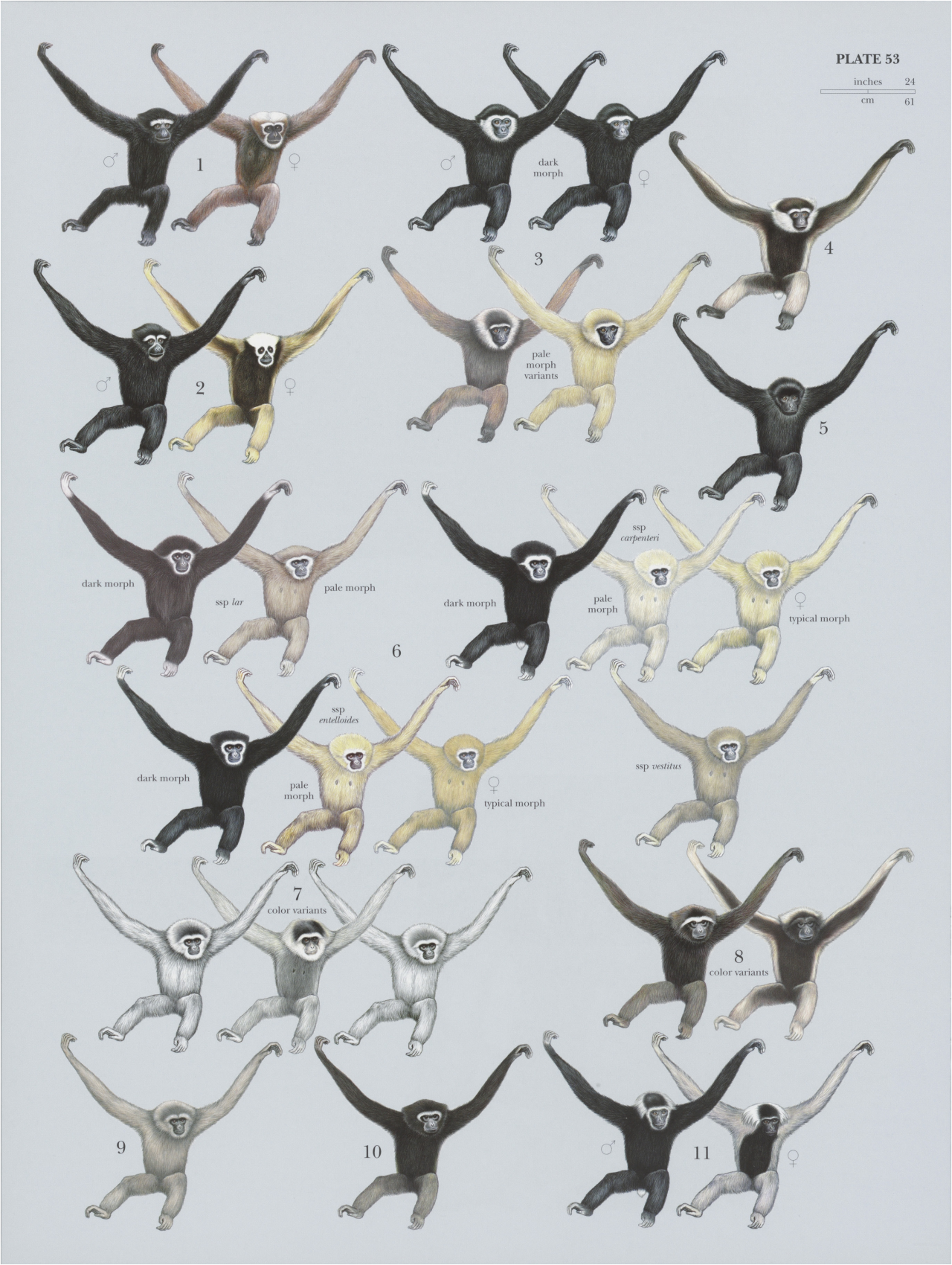 Hylobates gibbon species: 1) Western Hoolock Gibbon (Hoolock hoolock), 2) Eastern Hoolock Gibbon (Hoolock leuconedys), 3) Agile Gibbon (Hylobates agilis), 4) Bornean White-bearded Gibbon (Hylobates albibarbs), 5) Kloss’s Gibbon (Hylobates klossu), 6) Lar Gibbon (Hylobates lar), 7) Moloch Gibbon (Hylobates moloch), 8) Muller’s Gibbon (Hylobates muelleri), 9) Abbott's Gray Gibbon (Hylobates abbotti), 10) East Bornean Gray Gibbon (Hylobates funereus), 11) Pileated Gibbon (Hylobates pileatus)