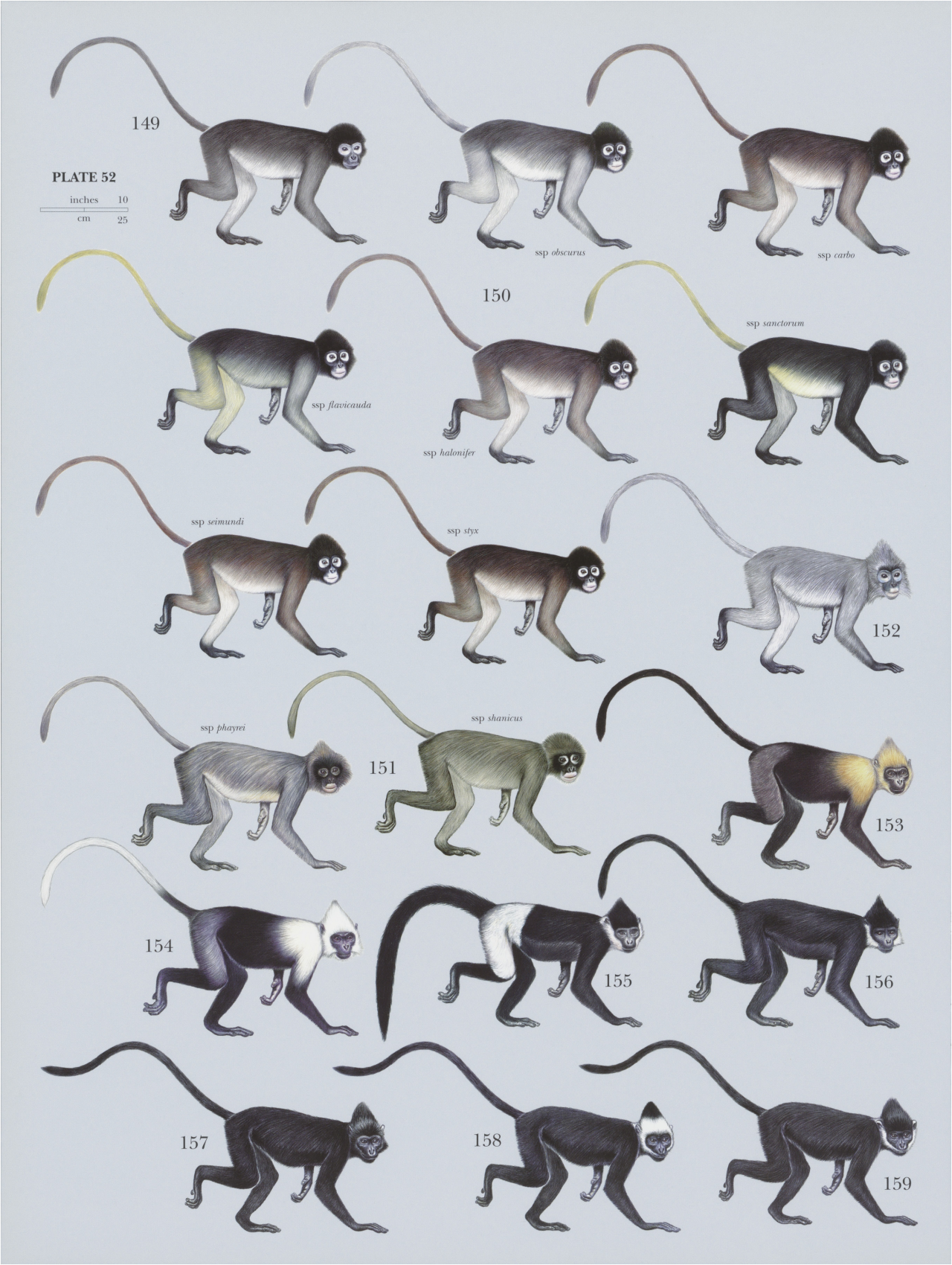 Trachypithecus Langur species: 149) Tenasserim Langur (Trachypithecus barber), 150) Dusky Langur (Trachypithecus obscurus), 151) Phayre’s Langur (Trachypithecus phayrei), 152) Indochinese Gray Langur (Trachypithecus crepusculus), 153) Cat Ba Langur (Trachypithecus poliocephalus), 154) White-headed Langur (Trachypithecus leucocephalus), 155) Delacour’s Langur (Trachypithecus delacouri), 156) Francois’s Langur (Trachypithecus francoisi), 157) Black Langur (Trachypithecus ebenus), 158) Laos Langur (Trachypithecus laotum), 159) Hatunh Langur (Trachypithecus hatinhensis)