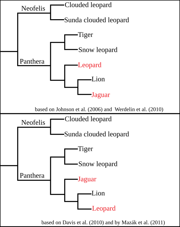 Proposed cladograms for Panthera; The upper one is based on two studies published in 2006 and 2009; the lower one is based on studies published in 2010 and 2011