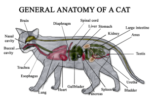 According to Animal Diversity Web (ADW): There are over 100 breeds of domestic cats but all have a very similar body shape and size. Interbreed variation is defined based on coat type and coloration or patterning of the fur. Domestic cat have approximately 244 bones in their body, of which about 30 are vertebrae (the number can vary depending upon the length of cat). With so many vertebrae in their spine, cats are very flexible and can rotate half of their spine 180°. They are capable of jumping five times their own height and are able to slip through narrow spaces because they have no collar bone and their scapulae lie medially on their body. Each forelimb (i.e., manus) has five digits and the hindlimbs (i.e., pes) have four.