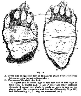 Tracie Goodness wrote in Animal Diversity Web The head is large and the eyes are small. The ears are large and are set farther apart than on an American black bear. The body is heavy, the legs are thick and strong, and the paws are broad. The stance is plantigrade. The tail is short and is barely visible under a long, coarse coat. [Source:Tracie Goodness, Animal Diversity Web (ADW) /=]