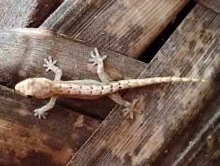 Krista Wu wrote in Animal Diversity Web: Common house geckos are usually grey or light brown to beige in color with greenish iridescence and a white underside. They also sometimes appear to be semi-transparent. Their scales are generally uniform anteriorally, but increase in size along the back, and large spiny scales are arranged in bands around the tail. Common house geckos has vertical pupils and has visual sensitivity to the dark. Their eyes are binocular and have a low convergence ratio with a high visual cell density. These modifications allow it to see during nighttime hours, when it is most active. Like most lizards, Common house geckos has four developed legs, a long tail, and a prehensile tongue for catching prey. Another characteristic of these geckos are their enlarged claws and adhesive toe pads. This aids their ability to climb walls and ceilings. /=\