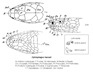 King cobras have broad, elongated heads with prominent jaws. The head is black on the back with four white cross-bars. The ventral part of head is white. They also have distinctively large, prominent nostrils, which may aid in their sense of smell. When their hood is open it displays a pattern resembling a pair of spectacles. Unlike true cobras, which have short, wide hoods, king cobras have a long narrow hood.