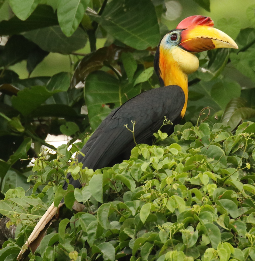 Males have a large red nob and an oversized red bill. After chicks are born, the male take care of almost all the food collecting duties. Figs on the volcano vary from pea-size to plum size. The hornbill’s favorite is a large cherry red fig that they eat in vast quantities and males present to females as a courtship gesture. They also eat berries, wild mangos, nutmegs, and avocado-like drupes. The birds are currently threatened by loss of habitat, which is vulnerable to catastrophic drought, fires and volcanic eruptions.