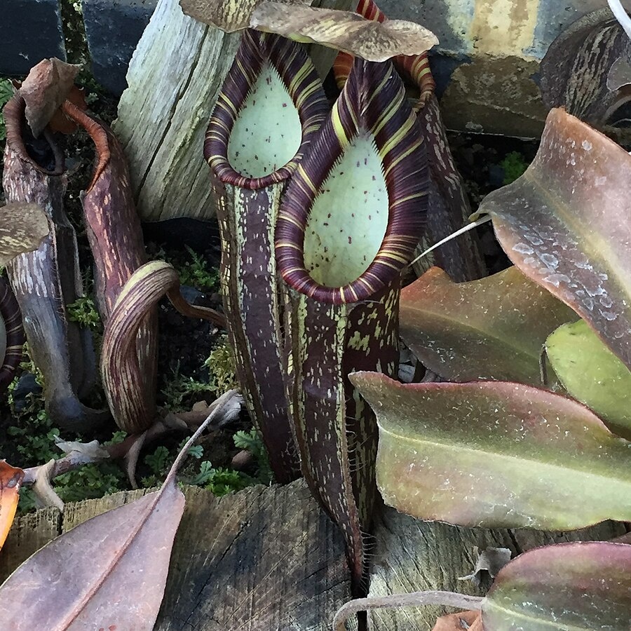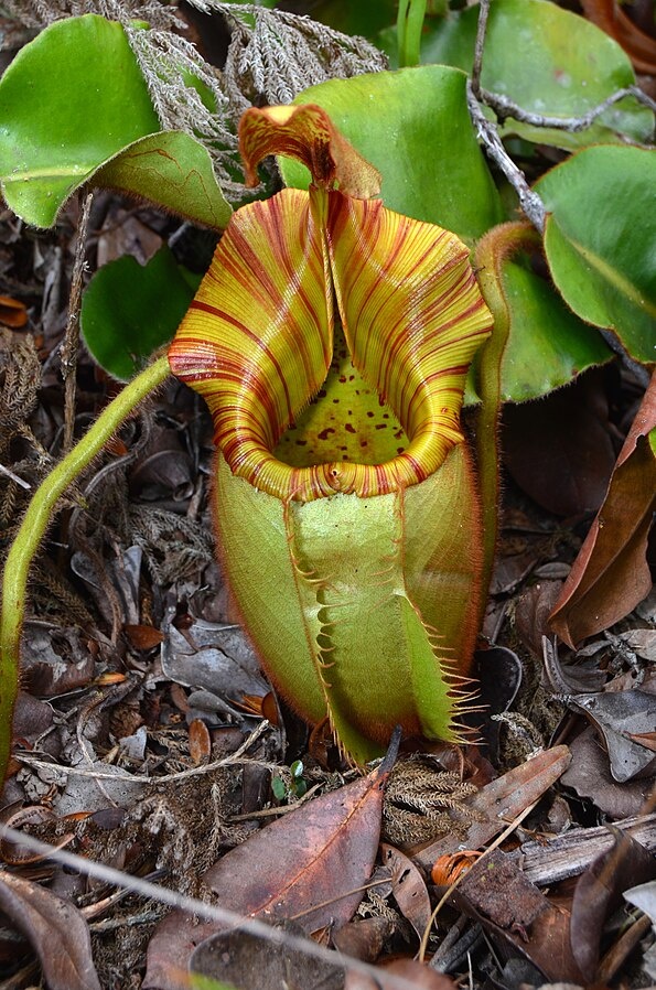 The fanged pitcher plant is so named because of a pair of thorn-like appendages that protrude form the bottom of the pitcher lid. The “Nepenthes veitchii” grows on wind-blown trees It is very colorful. Some have red-and-green or red-and white stripes. Other have bright yellow or red peristomes.