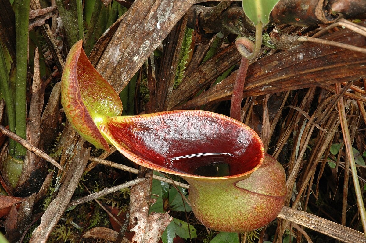 The N. lowii is pitcher plant species that lives in the highlands of several mountains in Borneo. “It bears distinctive pitchers, eight to ten inches high, each with a flaring, funnel-shaped mouth, a narrow waist, and a large lid that secretes copious quantities of a crystalline, sugary substance. The pitchers rarely catch insects but are filled with feces from animals such as treeshrews or small squirrels that feed o invertebrates and sweet fruits.