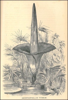 Describing the flower he saw, David Attenborough wrote in “The Private Life of Plants”, "Its spathe was shaped like an inverted bell with its point close to the ground. It was strengthened by long white ribs, like the spokes of a half-opened upside-down umbrella. Its upper margin was frilled. Outside, it was creamy green, but inside an intense and glowing crimson. From the center of this rose the huge spandix, like a wrinkled greyish spire. It was so out of scale with every other plant around it that its seemed to belong to another world."