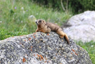 Long-tailed marmotsc(Marmota caudata) are also known as golden marmots and red marmots. They live in mountainous regions in Central Asia in open or lightly wooded habitats, often among rocks where dwarf junipers grow. They are most common in mountain meadows frequently grazed by domestic sheep, goats, and yaks as well as semi arid plateus and the edges of nut-forests.