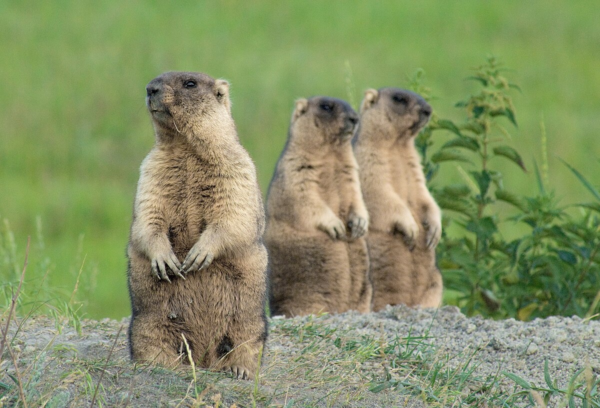 Marmots (genus Marmota) are giant ground squirrels found primarily in North America and Eurasia. Marmots are the heaviest members of the squirrel family. There are 14 species of them. Some marmot species live in mountainous areas, such as the Deosai Plateau in Pakistan and Ladakh in India and the Alps, Carpathians and Tatras in Europe. Other species prefer rough grassland and can be found widely across the Eurasian Steppe. Slightly smaller and more social prairie dogs are not classified in the genus Marmota; they are in the related genus Cynomys. [Source: Wikipedia]