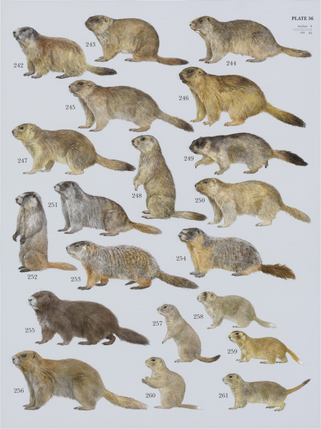 Marmot species: 243) Bobak Marmot (Marmota bobak), 244) Forest Steppe Marmot (Marmota kastschenkot), 245) Gray Marmot (Marmota baibacina), 246) Long-tailed Marmot (Marmota caudata), 247) Menzbier’s Marmot (Marmota menzbieri), 248) Himalayan Marmot (Marmota himalayana), 249) Black-capped Marmot (Marmota camischatica), 250) Tarbagan Marmot (Marmota sibirica), 251) Alaska Marmot (Marmota broweri), 252) Hoary Marmot (Marmota caligata), 253) Woodchuck (Marmota monax), 254) Yellow-bellied Marmot (Marmota flaviventer), 255) Vancouver Island Marmot (Marmota vancouverensis), 256) Olympic Marmot (Marmota olympus), 257) Black-tailed Prairie Dog (Cynomys ludovicianus), 258) White-tailed Prairie Dog (Cynomys leucurus), 259) Utah Prairie Dog (Cynomys parvidens), 260) Gunnison’s Prairie Dog (Cynomys gunnisoni), 261) Mexican Prairie Dog (Cynomys mexicanus)