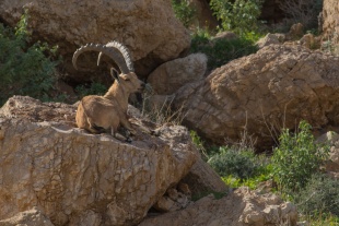 Nubian ibex (Capra nubiana) inhabits the desert regions of the Middle East and the Itbay region of Sudan and Egypt. They are the smallest ibex species and adapted for arid environments with a tan color, white underbelly and rump, black legs, and dark tail. This species is Vulnerable, with less than 4,500 individuals in the wild. The population is declining through most of its range.