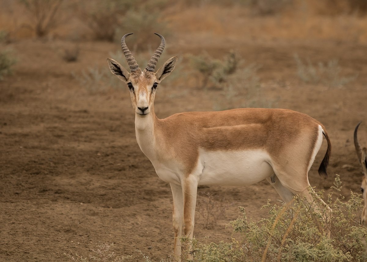 Goitered gazelles (Gazella subgutturosa) are also known as black-tailed gazelles. They are native to Eurasia and found in a vast swath of Central Asia and the Middle East in Turkey, Georgia, Azerbaijan, Iran, parts of Iraq and Pakistan, Afghanistan, Tajikistan, Kyrgyzstan, Uzbekistan, Turkmenistan, Kazakhstan, northwestern China and Mongolia. Their common name and specific name (meaning "full below the throat") refers to the enlargement of the neck and throat of males during the mating season.[Source: Wikipedia]
