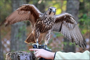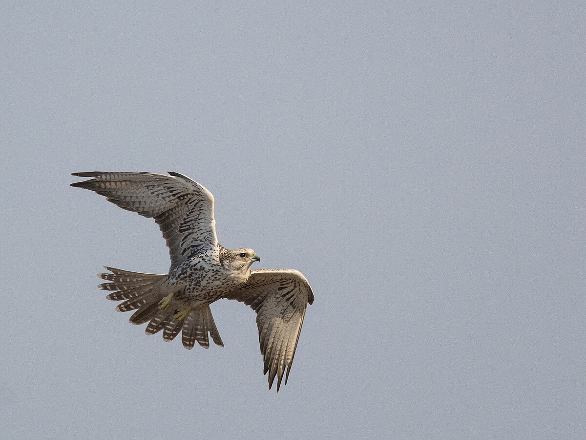 Saker falcons are fast and powerful. They are effective against medium-sized to large-sized game bird species. They can reach speeds of 120 to 150 km/h and suddenly swoop down on their prey. But sakers often hunts by horizontal pursuit, rather than the peregrine's stoop from a height. Saker falcon and peregrine falcons have been hybridised to produce falcons used in the control of larger birds considered pests. However, In the Middle East many falconers release their sakers because it is difficult to care for them during the hot summer months, and many trained birds escape. [Source: Wikipedia]