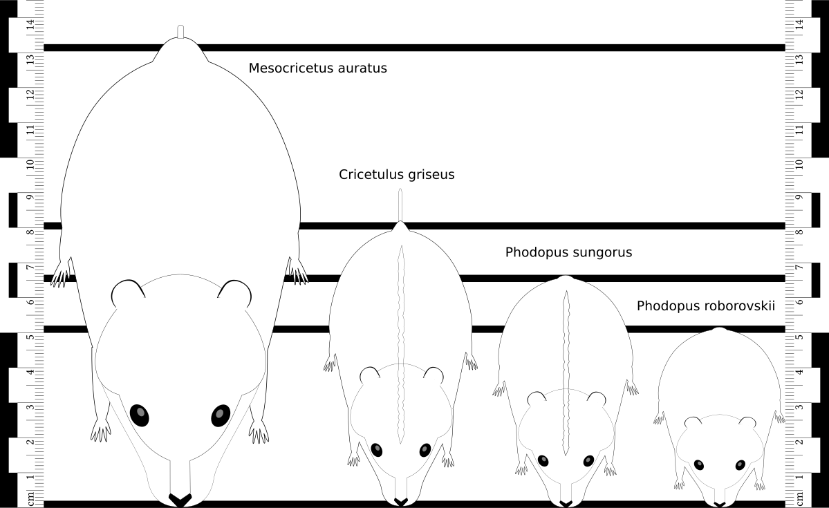 Allison Kolynchuk wrote in Animal Diversity Web: In accordance with their small body size, the skull is delicate with a long and slender rostrum (hard, beak-like structures projecting out from the head or mouth). The braincase is broad in front, while rounded dorsally. Their auditory bullae are reduced and flattened. These hamsters possess a pair of upper and lower arc-shaped, ever-growing, groove-less incisors. The sharpness of the incisors is maintained through resistance to wear on the hard, enamelled, buccal tooth edge. The feet consist of short and broad bones internally, while they are densely furred externally to protect against the heat of the sandy soils. As with all rodents Roborovski hamsters are gnawing animals. Internal cheek pouches are used to store and transport food to caches. Cheek pouches are an extension of the oral cavity and, when full, extend past the shoulders. Roborovski hamsters possess both a forestomach and a glandular stomach. The small intestine makes up 60 percent, the large intestine 27 percent and the caecum 13 percent of the total length of the intestine. The species has a diploid karyotype of 2n = 34 chromosomes, which is higher than that of striped desert hamsters (Phodopus sungorus). /=\