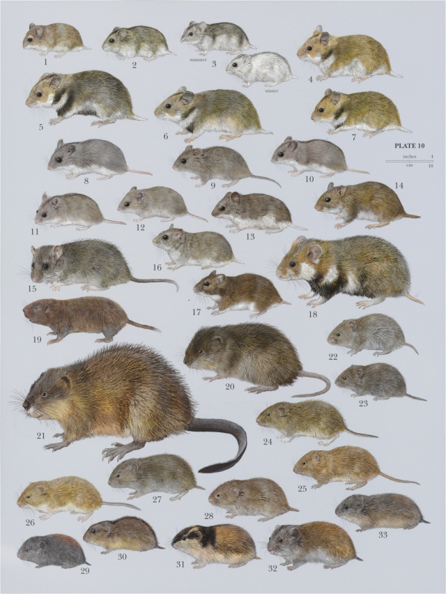 Hamster, vole and lemming species: 1) Roborovski’s Desert Hamster (Phodopus roborouskii), 2) Campbell's Desert Hamster (Phodopus campbelli), 3) Striped Desert Hamster (Phodopus sungorus), 4) Golden Hamster (Mesocricetus auratus), 5) Ciscaucasian Hamster (Mesocricetus radder), 6) Brandt's Hamster (Mesocricetus brandii), 7) Romanian Hamster (Mesocricetus newtoni), 8) Gray Dwarf Hamster (Cricetulus migratorius), 9) Long-tailed Dwarf Hamster (Cricetulus longicaudatus), 10) Striped Dwarf Hamster (Cricetulus barabensis), 11) Sokolov’s Dwarf Hamster (Cricetulus sokolouvi), 12) Ladakh Dwarf Hamster (Cricetulus alticola), 13) Tibetan Dwarf Hamster (Cricetulus kamensis), 14) Gansu Hamster (Cansumys canus), 15) Greater Long-tailed Hamster (Tscherskia triton), 16) Mongolian Hamster (Allocricetulus curtatus), 17) Eversmann’s Hamster (Allocricetulus eversmanni), 18) Common Hamster (Cricetus cricetus), 19) Long-clawed Mole Vole (Prometheomys schaposchnikowi), 20) Round-tailed Muskrat (Neofiber alleni), 21) Common Muskrat (Ondatra zibethicus), 22) Western Heather Vole (Phenacomys intermedius), 23) Eastern Heather Vole (Phenacomys ungava), 24) White-footed Vole (Arborimus albipes), 25) Red Tree Vole (Arborvmus longicaudus), 26) Sonoma Tree Vole (Arborimus pomo), 27) Northern Bog Lemming (Synaptomys borealis), 28) Southern Bog Lemming (Synaptomys cooperi), 29) Wood Lemming (Myopus schisticolor), 30) Amur Brown Lemming (Lemmus amurensis), 31) Norway Brown Lemming (Lemmus lemmus), 32) Siberian Brown Lemming (Lemmus sibiricus), 33) Nearctic Brown Lemming (Lemmus trimucronatus)