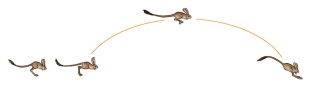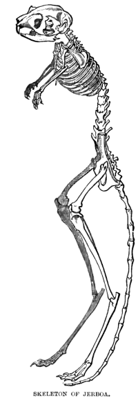 Jerboas feed on insects, seeds, and succulent vegetation. In many ways they are remarkably similar to the kangaroo rats (Heteromyidae) of North America. Both have greatly inflated bullae; a very long tail, often tipped black and white; fused or nearly fused cervical vertebrae; and soft, silky fur, usually pale in color. They both employ leaping locomotion that utilizes their enlarged and powerful hind feet. This is a type of movement is found in many desert rodents and is thought to be beneficial because, although it often wastes energy, it allows an animal to move quickly, change direction rapidly, and even jump up to avoid predators like snakes. This is important in desert environments where there is little cover. [Source: Sharon Jansa, Janae Chavez, Phil Myers, Animal Diversity Web (ADW) /=]