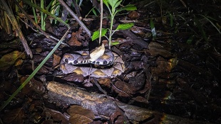 Kraits are nocturnal hunters. The banded krait (Bungarus fasciatus) is one of the largest krait species and can reach two meters feet in length; the smaller many-banded krait (Bungarus multicinctus) averages about 1.7 meters. Krait venom is one of the strongest snake venoms. Two true vipers make their home southern China: Fea’s viper (Azemiops feae) and the Russell’s viper (Daboia russelli), one of the most bad-tempered and deadliest snakes known. Russell’s vipers eats large rodents and occasionally birds.