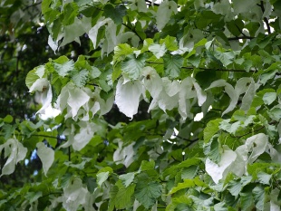 Chinese Dove Tree (Davidia involucrata Baillon) is an ancient, rare and beautiful tree. When it is in full bloom, the two distinctive big bracts under the anthodium look very much like a doves tree with their wings open — hence its name. Because its anthodium and the morphological characteristics of the flower are different from other genera of the same family, some scholars place it an independent family. The fine timber wood of this a world-famous ornamental tree can be used to make furniture. An autogenus plant unique to China, the Chinese dove tree is a relic of the palaeotropical flora in the tertiary period. Due to overlogging and transplantation of wild saplings, both the number and area in which this tree is found of wild is very small now, mostly broad-leaved forest or mixed forest of evergreen and deciduous trees at an altitude 1450 to 1800 meters. Wolong Natural Reserve, famous of its pandas, contains 70,000 hectares of these trees.