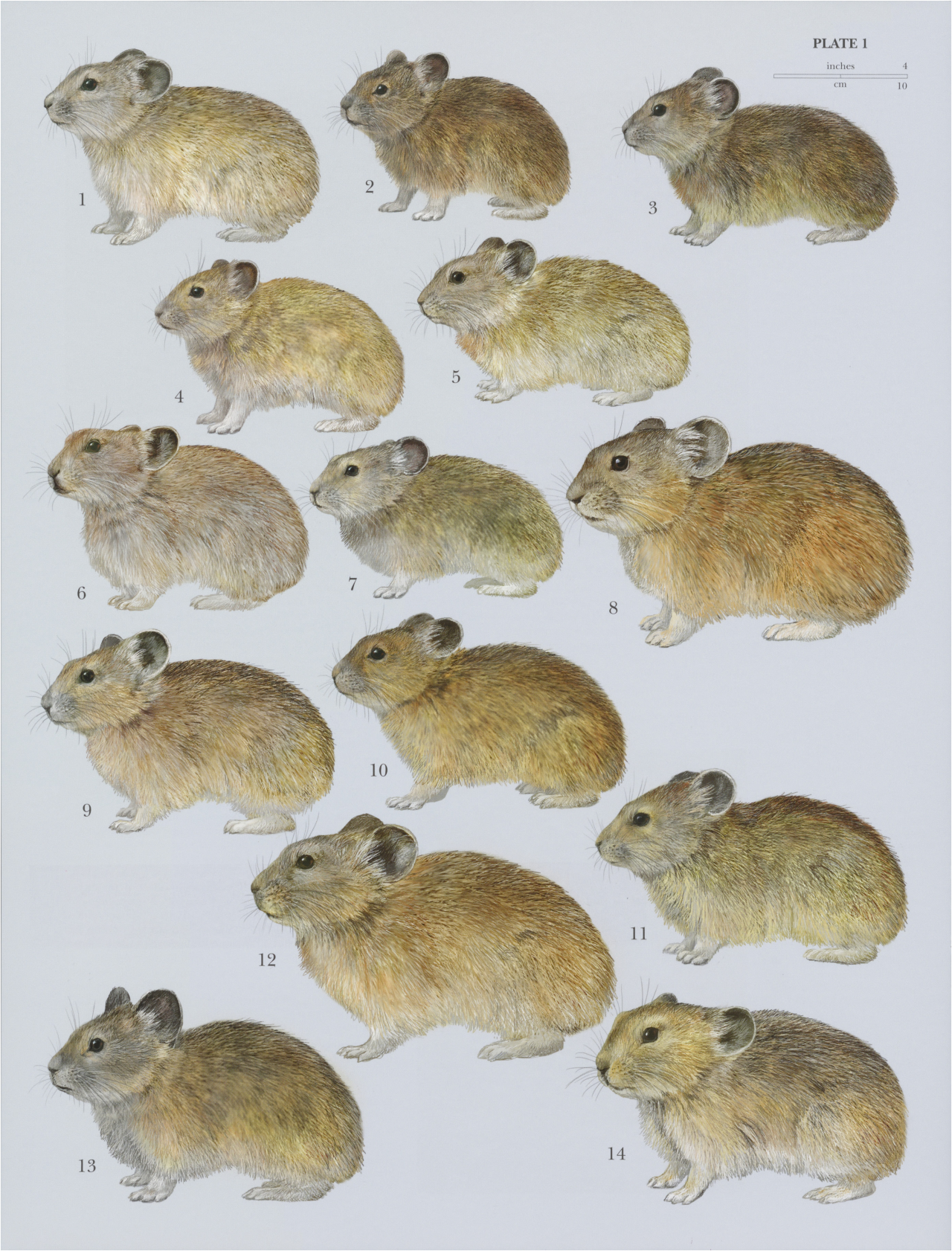 Pika species: 3) Tsing-ling Pika (Ochotona syrinx); 4) Gansu Pika (Ochotona cansus); 5) Nubra Pika (Ochotona nubrica); 6) Plateau Pika (Ochotona curzoniae); 7) Thomas's Pika (Ochotona thomasi); 8) Alpine Pika (Ochotona alpina); 9) Turuchan Pika (Ochotona turuchanensis): 10) Northern Pika (Ochotona hyperborea); 11) Manchurian Pika (Ochotona mantchurica); 12) Hoffmann's Pika (Ochotona hoffmanni); 13) Korean Pika (Ochotona coreana), 14) Pallas's Pika (Ochotona pallasii)