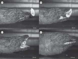 Chinese giant salamanders are ambush predators. They don't seek and attack prey but rather open their mouth to wait for their prey to enter their mouth, and then slam it shut. When prey is near their mouth they employ buccal suction. The elastic cartilage in their jaws is shaped so that one side of their mandible becomes severely depressed, which causes asymmetrical suction. Prey is then sucked into their mouths.