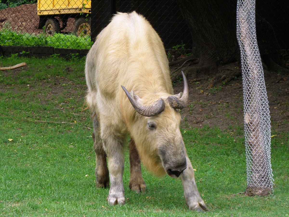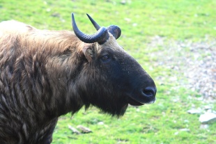 Takin (Budorcas taxicolor) are odd-looking animals with a moose-like face and musk-ox-style horns. Also called cattle chamois and gnu goats, they are large ungulate-bovids in the subfamily Caprinae (goats) and live in the eastern Himalayas. Four subspecies are recognized: 1) the Mishmi takin (B. taxicolor taxicolor), 2) the golden takin (B. taxicolor bedfordi), 3) the Tibetan (or Sichuan) takin (B. taxicolor tibetana), and 4) the Bhutan takin (B. taxicolor whitei). On the past takin were were placed together with the muskox in the tribe Ovibovini, more recent mitochondrial DNA research places them closer to Ovis (sheep). The physical similarity between muskox and takin is therefore viewed as an example of convergent evolution. The takin is the national animal of Bhutan.