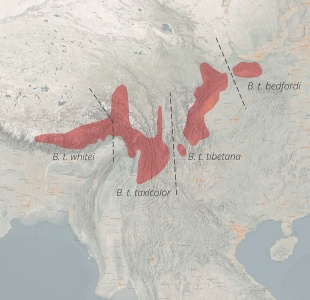 The preferred habitats of Takin in China are forests and marshy grassland in high and middle mountains, where they eat all kinds of tree leaves and grass. They can be found in the Hengduan Mountain in West Yunnan and the Qinling Mountain in Northwest China. The species lives in Qinling area of Shanxi are yellow or golden. While the species lives in Southeast of Tibet and West Yunnan are deep brown. In western China, Takin are relatively easy to find on the Qinling Mountains between Sichuan and Shaanxi provinces, because of State protection and no competitors in the wild. [Source: Center of Chinese Academy of Sciences, kepu.net.cn]